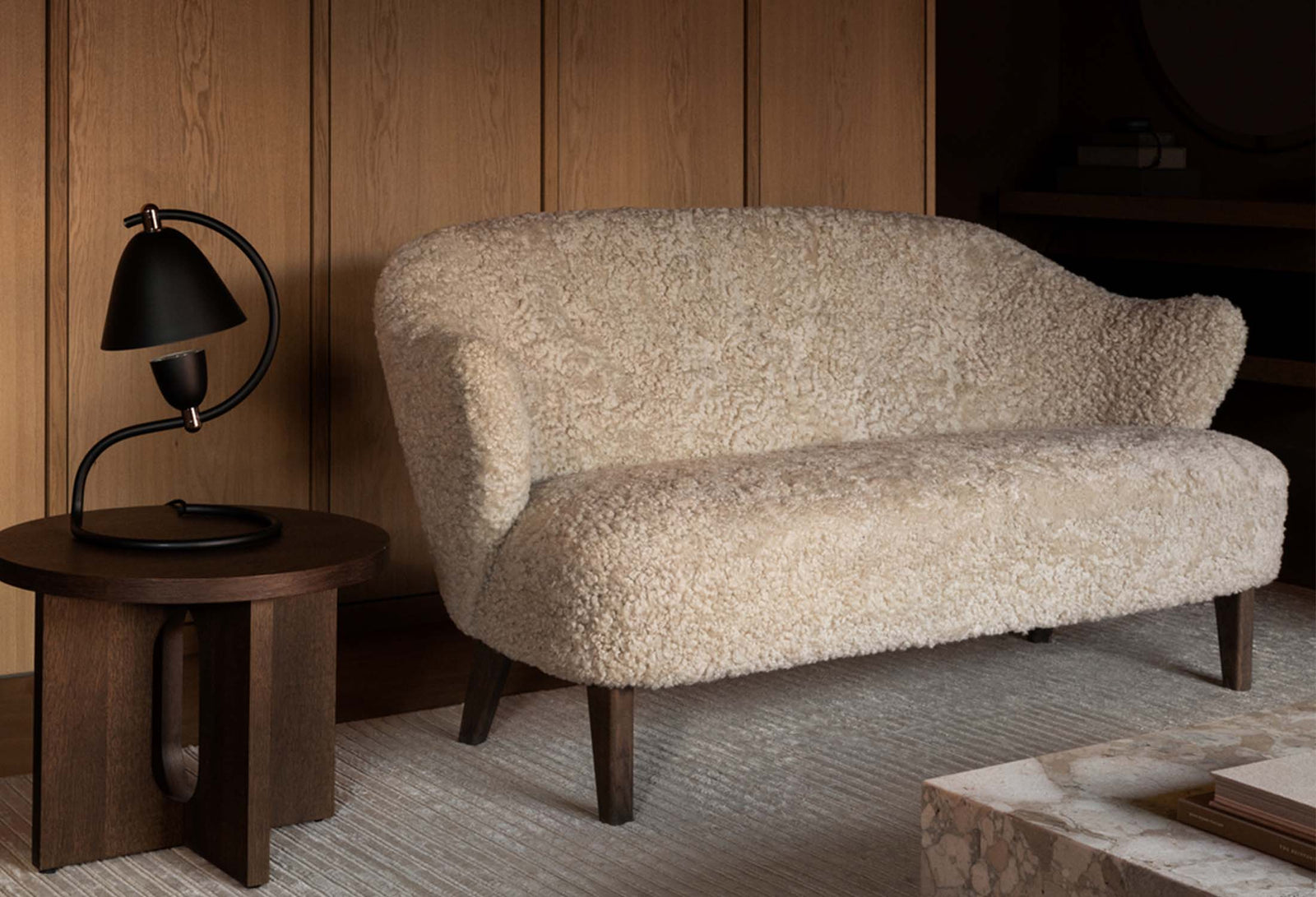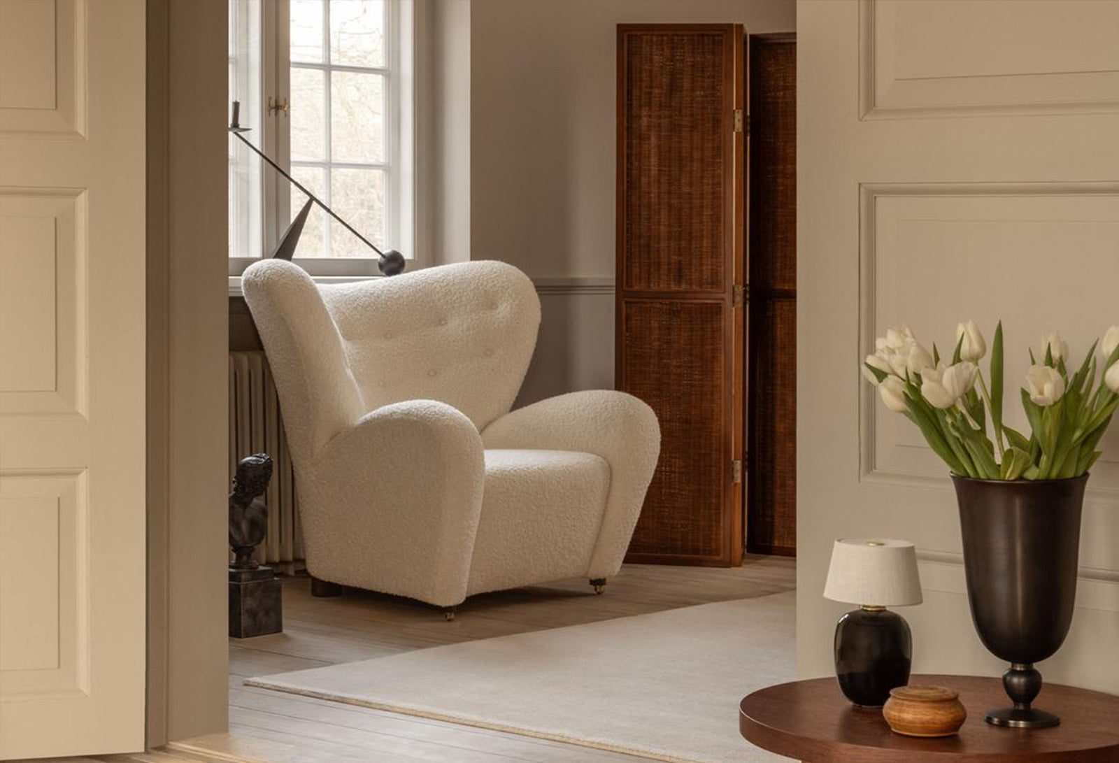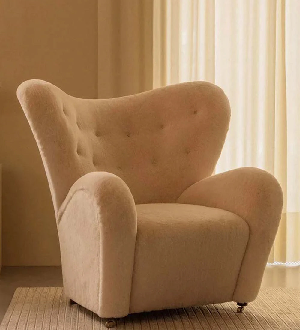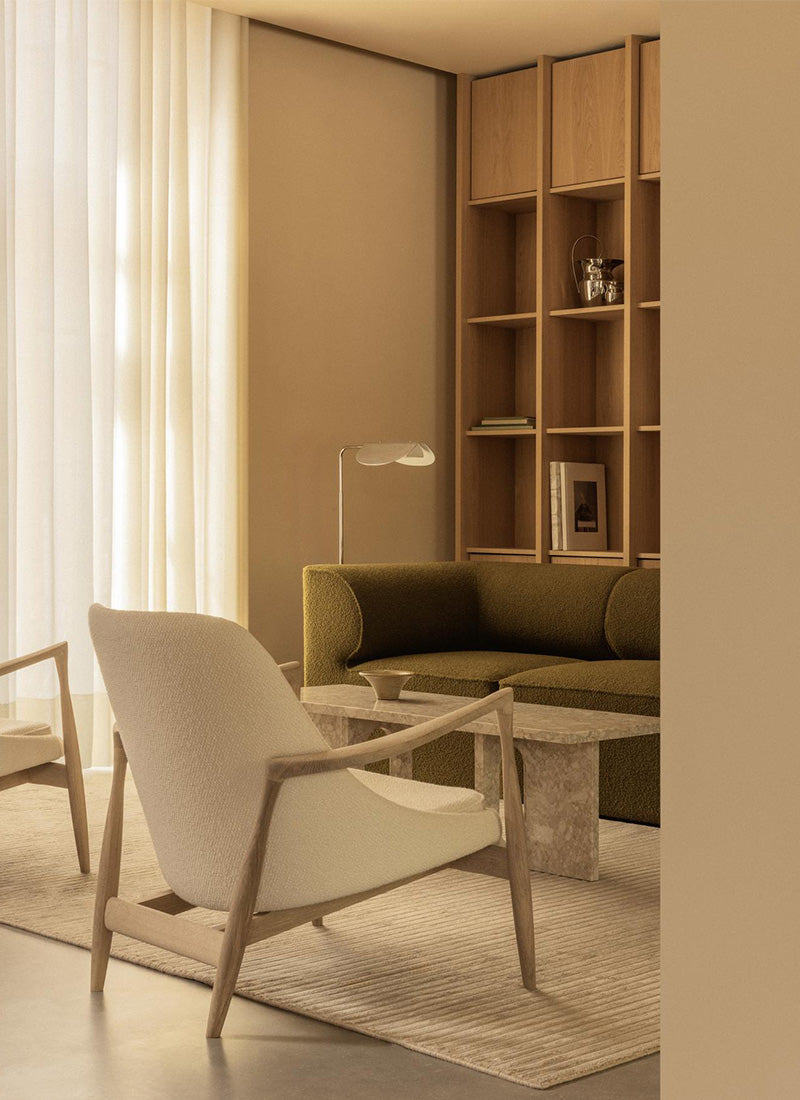 Originally titled "Den trætte mand," the tired man chair debuted at the Copenhagen Cabinetmakers’ Guild Exhibition in 1935 and has since become a hallmark of Danish design. Designed by Flemming Lassen, the distinctive armchair with its gently rounded form was intended to evoke the warmth and coziness of “a polar bear cub in its mother’s arms.” Relaunched in 2015, this celebrated piece is now available in luxurious upholstery options, including sheepskin as a tribute to the original. It features legs crafted from either natural or dark-oiled oak heartwood, along with front brass casters for effortless mobility. A matching footstool is also available to enhance the overall comfort.