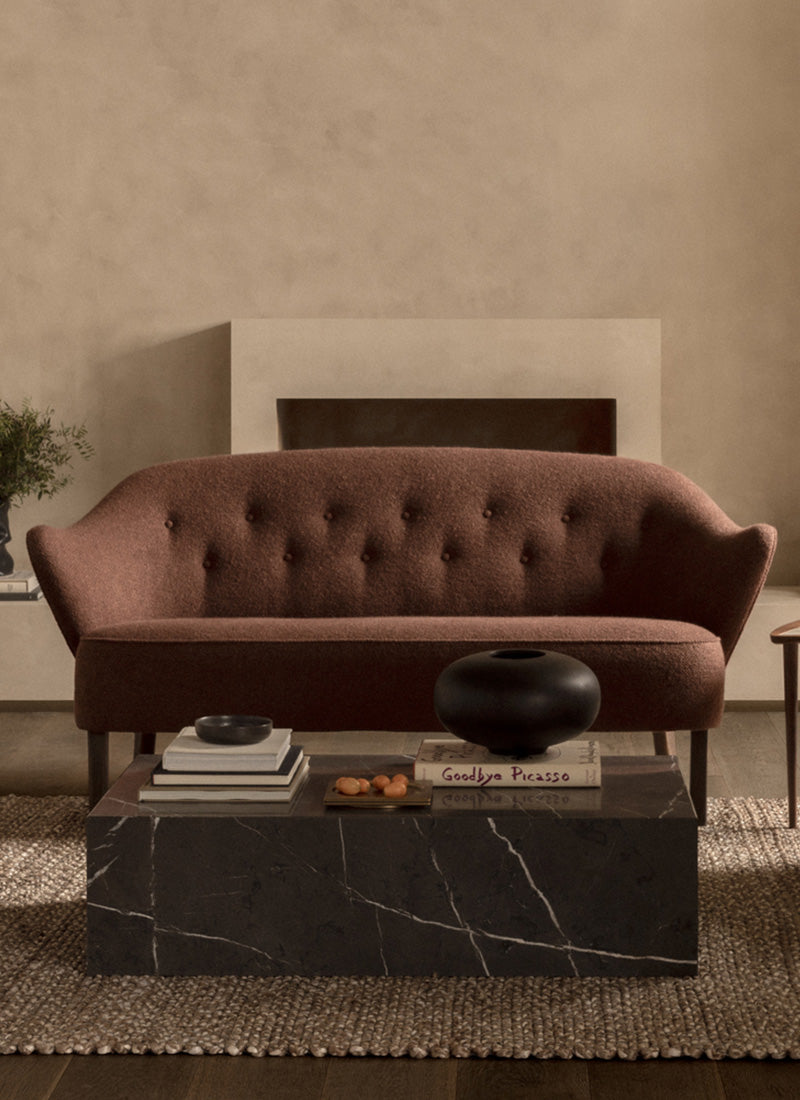 Featuring signature curved armrests, a buttoned backrest, and elegant wooden legs, its generous proportions offer both visual charm and inviting comfort. Sharing the same sculptural aesthetic as its companion lounge chair, the two form a warm and cohesive pair in any modern interior. The Ingeborg Sofa is available in a variety of refined upholstery options, with legs offered in natural oak or smoked oak.