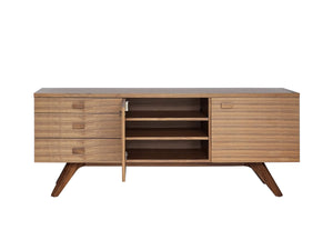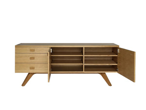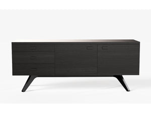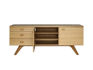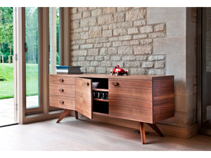 The simple lines of the Cross Sideboard by Matthew Hilton are distinctively modern. The sideboard is configured with three drawers on the left side and two doors on the right.