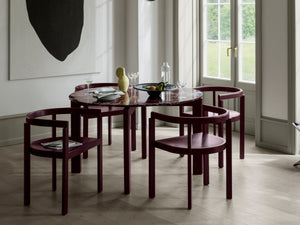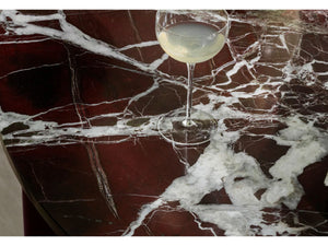 • Materials: Solid wood in Clear oiled ash or Burgundy coloured ash with a honed, marble tabletop.