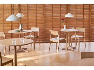 • Material: Seat and back in lacquered moulded plywood. Top veneer in oak, ash or walnut