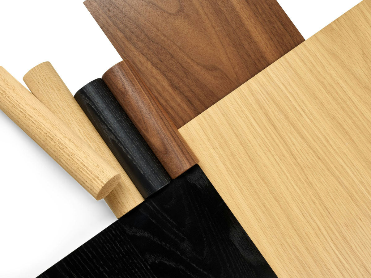 Materials: Frame in solid wood finished in natural white oak, ebonised ash or Oxford walnut. The seat and backrest panel are made from curved plywood, topped with sliced veneer in a wood finish similar to the frame.