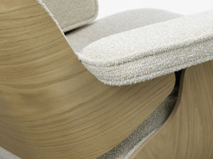• Materials: Seat and backrest shells in moulded plywood with face veneer in natural chestnut from Central Europe, finished with a water-based varnish. Removable foam cushions and fabric covers. The armrests - foam-padded with removable fabric covers - are attached to the seat and back shells with shock mounts (bonded rubber and metal connectors). Polished or black-powder-coated die-cast aluminium back braces and base with black glides soft for hard floor as standard (if you need glides for carpet please make a note on the order) Fabric - Nubia, polyester: 43%, new wool: 30%, polyacrylics: 25%, polyamide: 2% 35000 Martindale test (Click on download link below for more information). Base - Aluminium Polished or sides Black powder-coated / Aluminium Polished